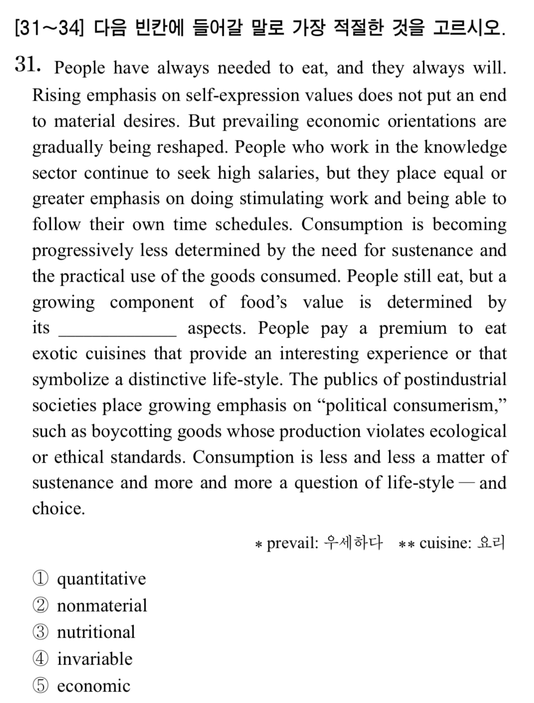 1 quantitative(양적인) 2 nonmaterial(비물질의) 3 nutritional(영양의) 4 invariable(불변의) 5 economic(경제적인)